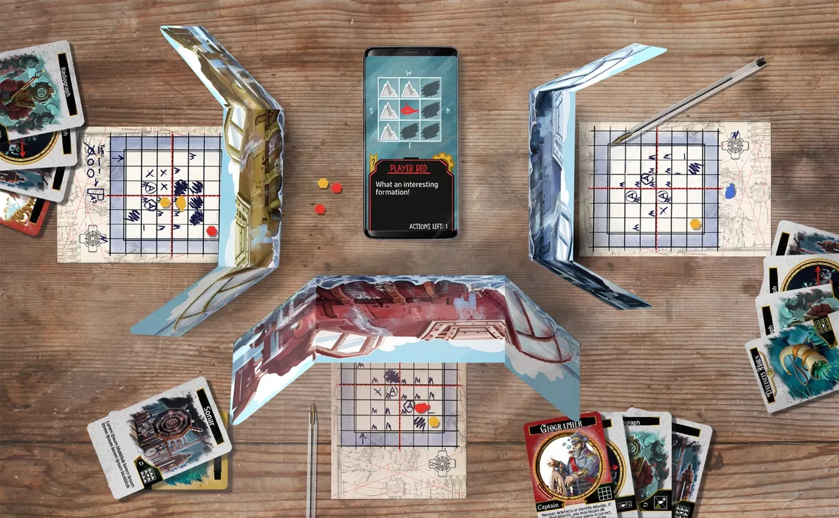 Finding Atlantis is a competitive deduction and exploration game with unique app-generated puzzles for 1-4 players. On a turn, you play two cards from your hand and resolve the action on these cards, moving your submarines on the map; inspecting the ocean floor via periscope, sonar, and radiograph; exploring for artifacts or stealing those artifacts from opponents; dropping mines to slow down those opponents; and surfacing to reset your deck. You track your findings on a hidden map, trying to be the first to discover all spaces of Atlantis.
